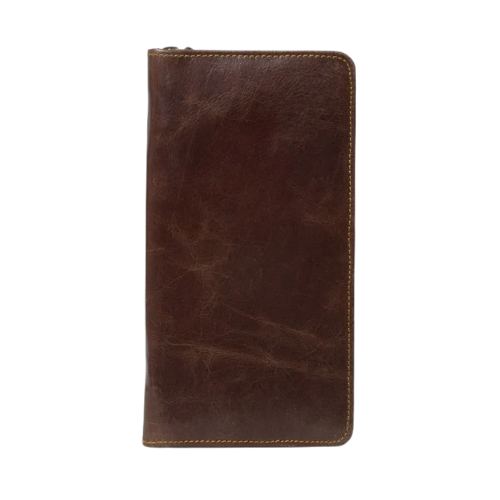 This dark brown leather travel wallet is crafted for style and utility, offering ample space for organizing cards, currency, and travel documents. Its vertical design, secure zip closure, and exterior stitched pocket make it an choice for professionals and travelers seeking a functional yet refined accessory.